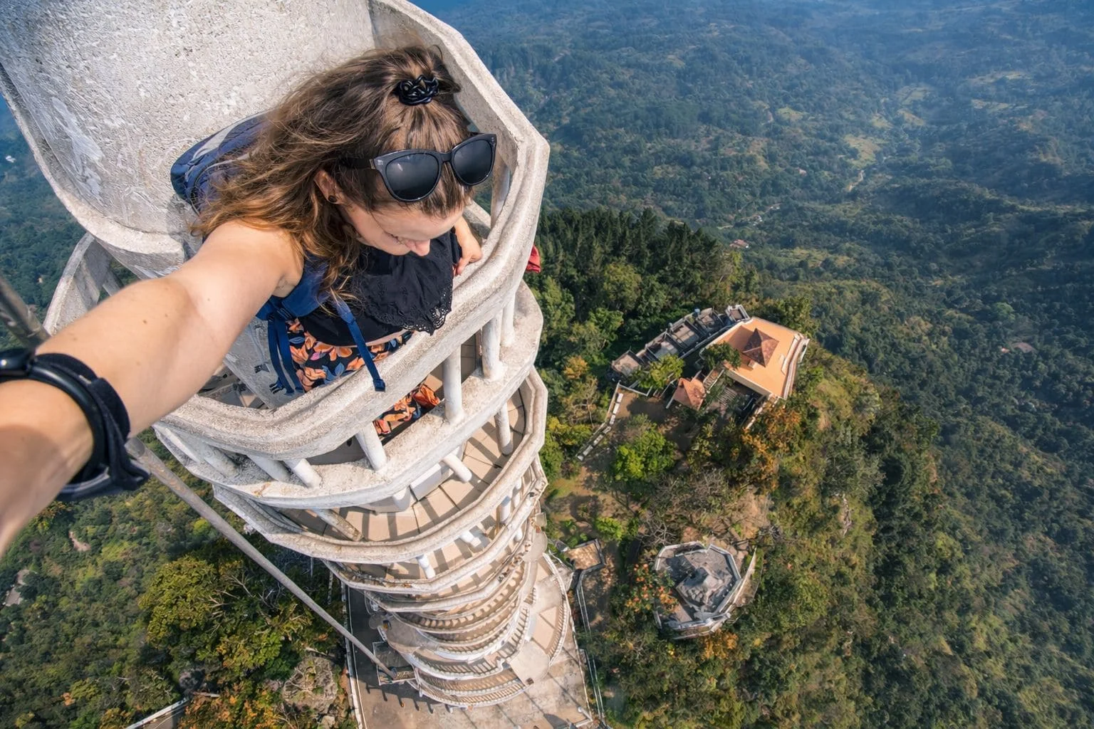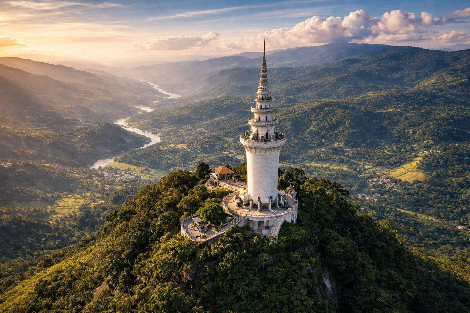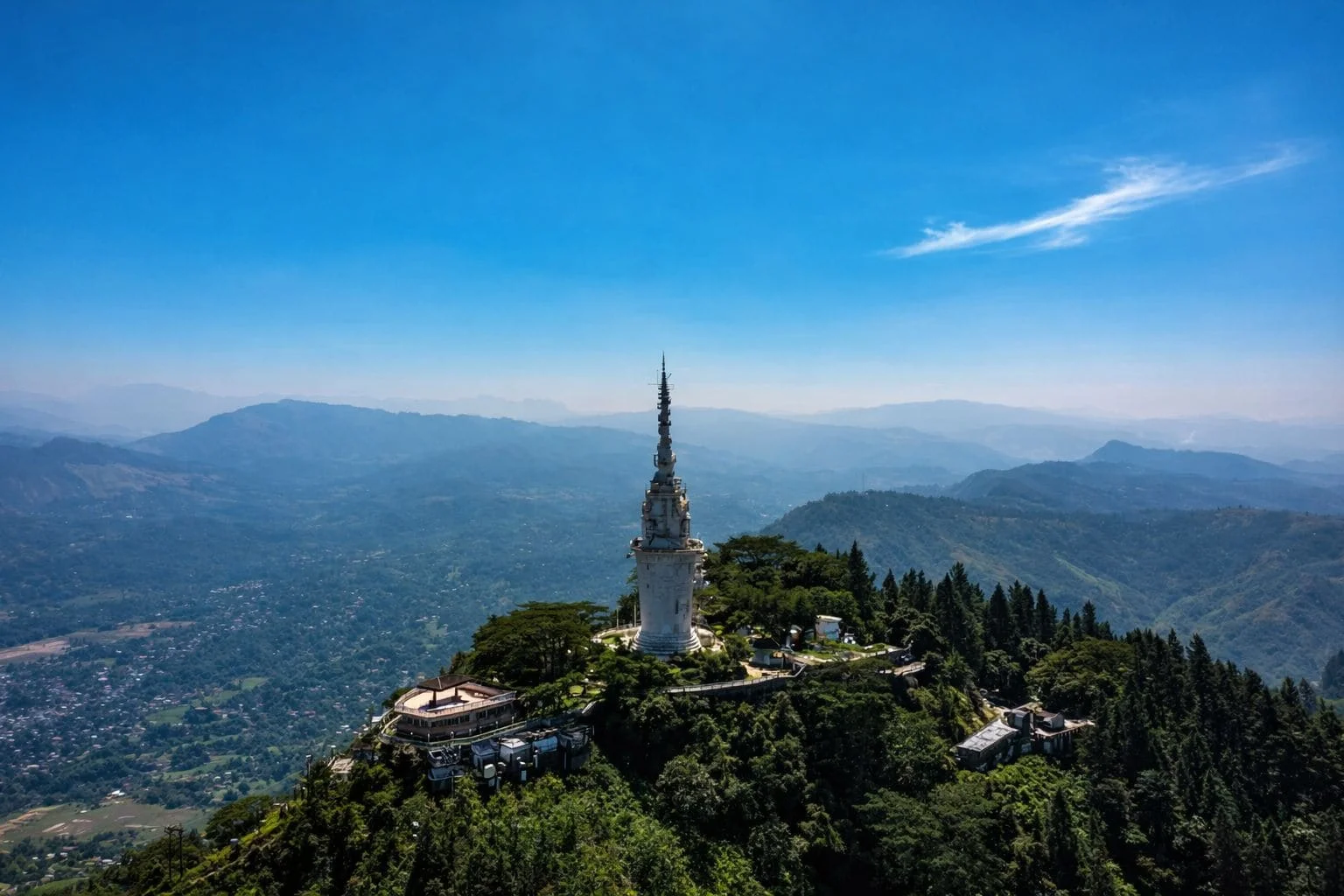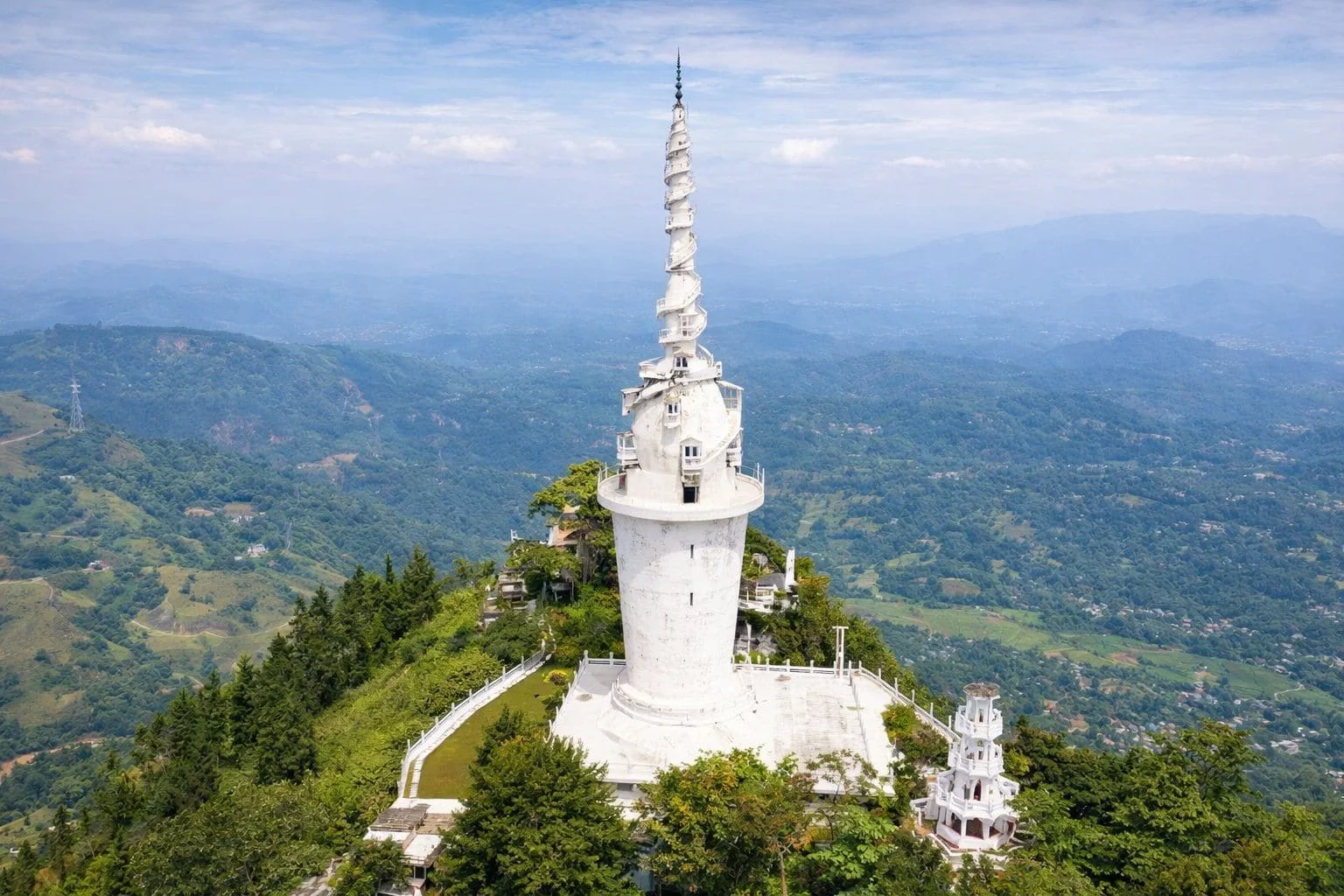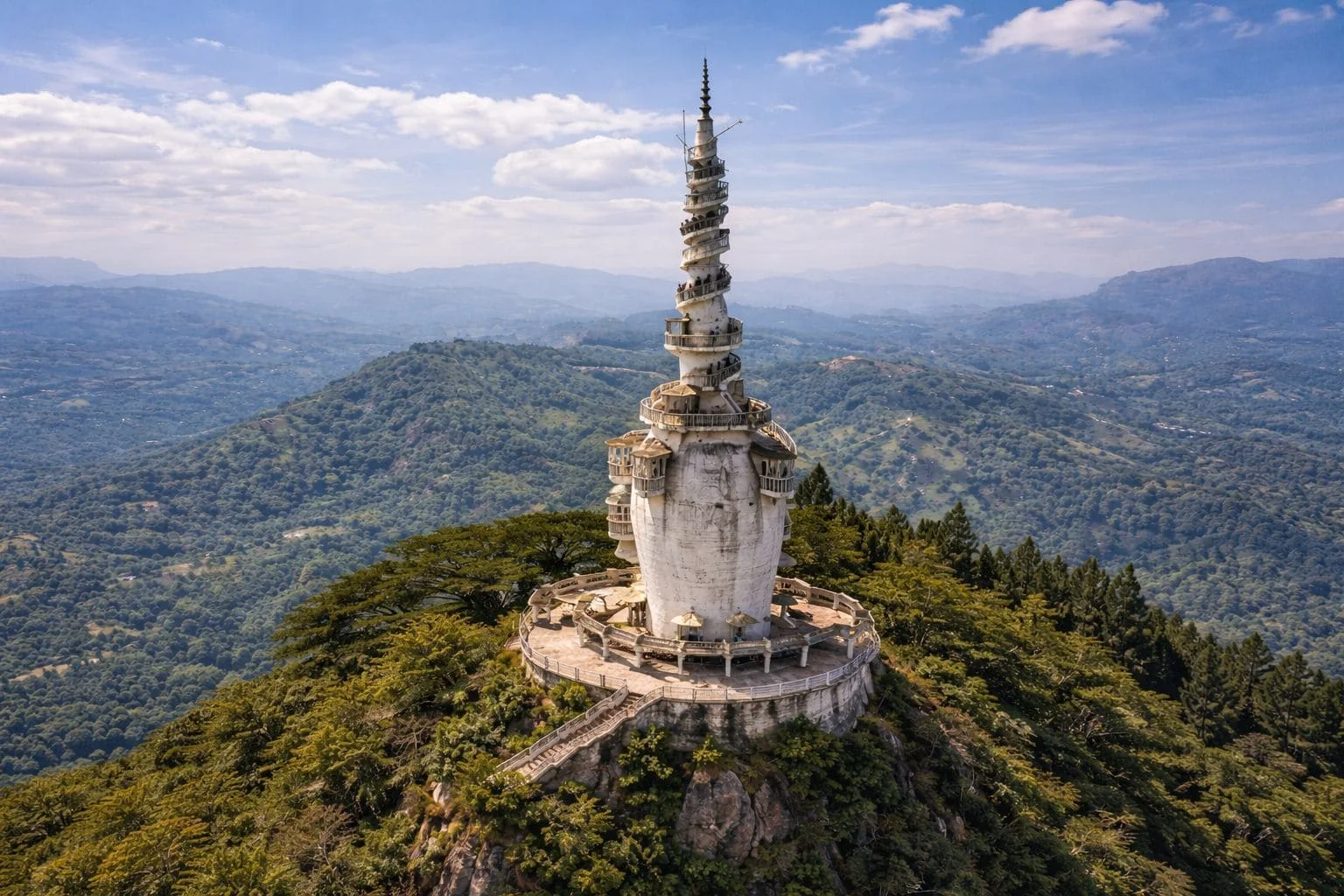 Ambuluwawa Tower is a striking landmark located in Gampola, Sri Lanka, within the Ambuluwawa Biodiversity Complex. Standing at about 48 meters tall, the white spiral tower is famous for its narrow winding staircase that wraps around the exterior, offering a thrilling climb and breathtaking 360-degree views from the top. Surrounded by lush mountains, forests, and misty landscapes, the tower provides panoramic views of several mountain ranges, including Pidurutalagala and Adam’s Peak on clear days. The site also promotes religious harmony, featuring a Buddhist temple, Hindu kovil, mosque, and church within the complex, making it a unique cultural and natural attraction.